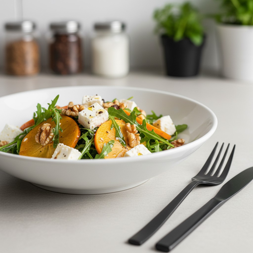 Découvrez une salade fraîche et colorée associant la douceur du kaki, la salinité de la feta, le croquant des noix et la fraîcheur poivrée de la roquette. Une recette simple et équilibrée, parfaite pour une entrée légère ou un déjeuner rapide.