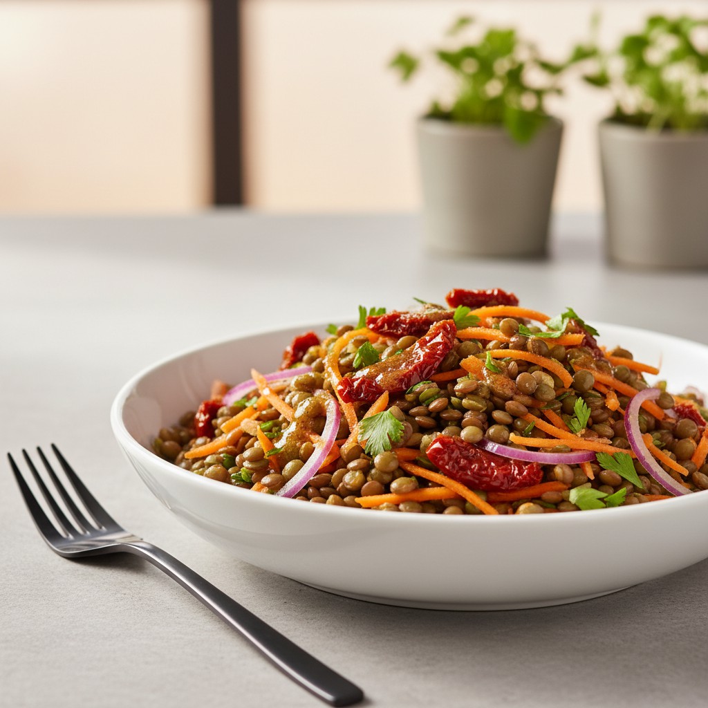 Salade de lentilles aux tomates séchées, carottes et vinaigrette maison