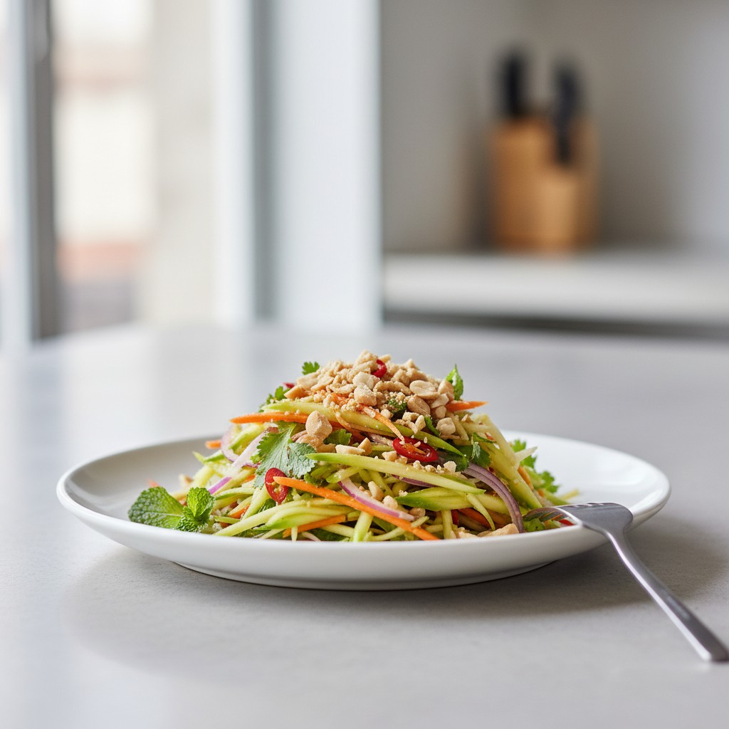 La salade de mangue verte est un classique de la cuisine d’Asie du Sud-Est, notamment en Thaïlande et au Vietnam. Elle séduit par sa fraîcheur, son croquant et l’équilibre subtil entre acidité, douceur, piquant et salinité. Cette recette met en valeur la mangue non mûre, à la chair ferme et acidulée, associée à des herbes fraîches, des cacahuètes grillées et une sauce relevée. Idéale en entrée légère ou en accompagnement, elle offre une alternative saine et gourmande aux salades classiques, tout en étant naturellement végétalienne et sans gluten.