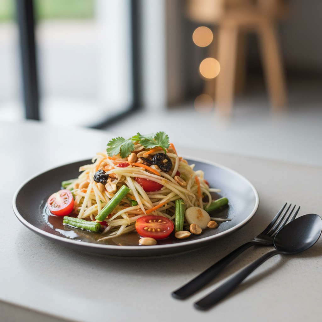 La salade de papaye verte thaïlandaise, appelée Som Tam, est un plat emblématique du nord-est de la Thaïlande. Elle marie la fraîcheur croquante de la papaye verte râpée à la puissance aromatique du piment, de l’ail, du citron vert et de la sauce de poisson. Cette recette, à la fois légère et pleine de caractère, offre un équilibre subtil entre acidité, salinité, douceur et piquant. Elle est idéale pour une entrée rafraîchissante ou un accompagnement sain, riche en fibres et pauvre en matières grasses. Traditionnellement préparée au mortier, elle met en valeur la technique du pilonnage pour révéler les saveurs sans abîmer la texture des ingrédients. Le Som Tam est aussi un excellent exemple de cuisine rapide, authentique et accessible, à condition de respecter quelques gestes clés.