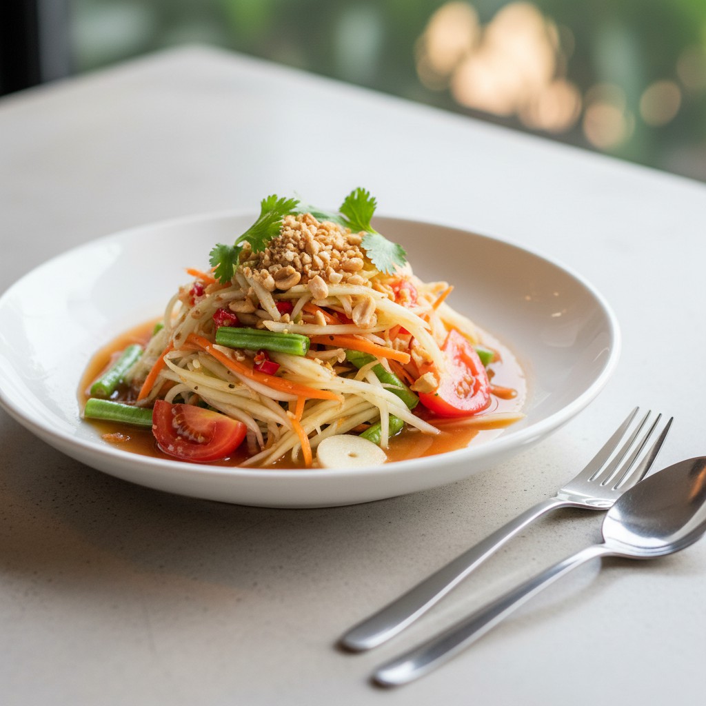 Découvrez cette recette traditionnelle de salade de papaye verte, un plat emblématique de la cuisine asiatique, particulièrement populaire en Thaïlande et au Vietnam. Croquante, fraîche et légèrement épicée, elle est sublimée par une sauce nuoc-mâm maison qui équilibre parfaitement les saveurs sucrées, salées, acides et umami. Idéale en entrée ou en accompagnement, cette salade est à la fois légère et riche en saveurs.