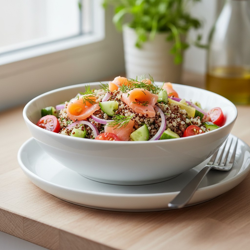 Une salade fraîche et équilibrée à base de quinoa, saumon fumé et aneth, idéale pour un repas léger ou une entrée raffinée. Cette recette associe des saveurs nordiques et des ingrédients sains pour un plat à la fois nutritif et savoureux.