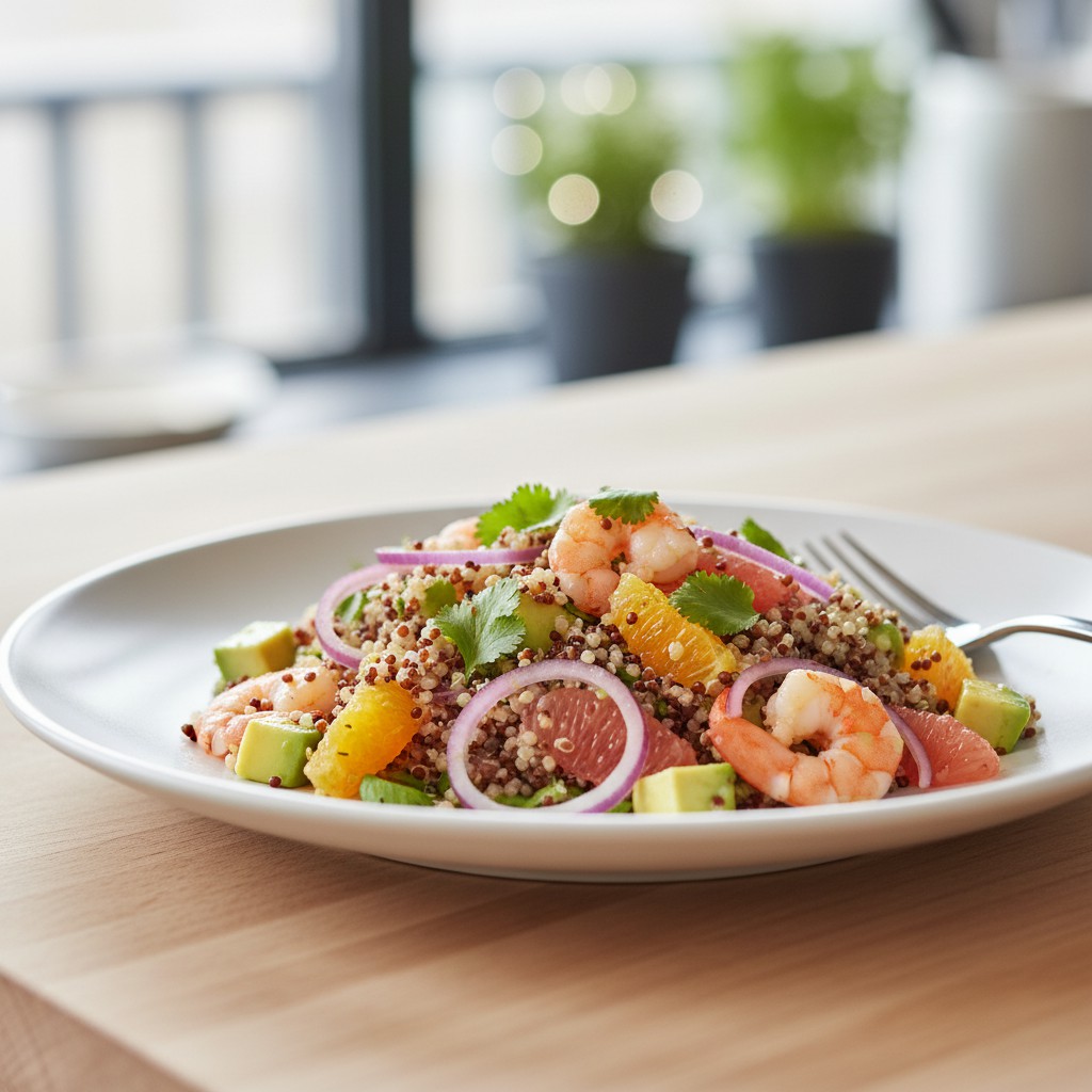 Cette salade de quinoa aux crevettes et agrumes marie fraîcheur, équilibre nutritionnel et textures contrastées. Riche en protéines complètes grâce au quinoa et aux crevettes, elle offre une belle diversité de vitamines et d’antioxydants apportés par les agrumes. Originaire d’une cuisine fusion moderne, elle s’inspire des salades composées méditerranéennes et sud-américaines, tout en valorisant la simplicité et la saisonnalité. Idéale pour un déjeuner léger ou un dîner estival, elle se distingue par son assaisonnement vif et sa facilité d’exécution, tout en restant élégante et rassasiante.