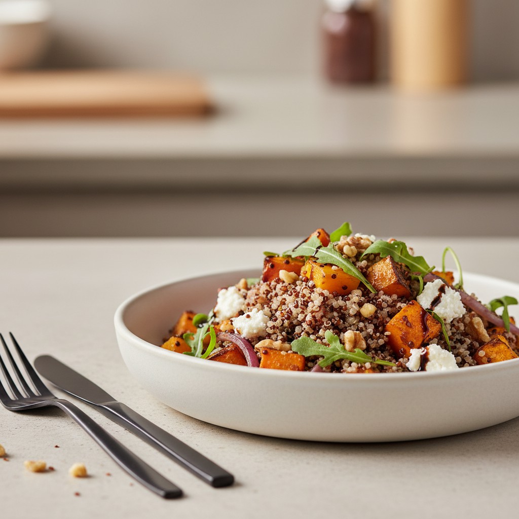- Dans un grand saladier, mélangez le quinoa cuit, les légumes rôtis, les noix ou noisettes concassées, et la roquette. Ajoutez le vinaigre balsamique et rectifiez l’assaisonnement en sel et poivre. Si vous le souhaitez, émiettez le fromage de chèvre frais par-dessus.