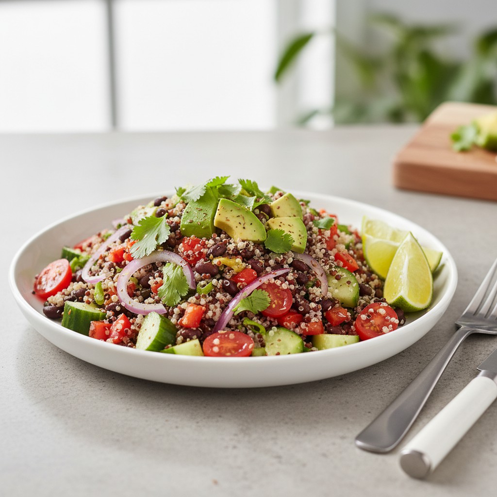La salade de quinoa et haricots noirs est un plat complet, équilibré et coloré, parfait pour un déjeuner nourrissant ou un dîner léger. Riche en protéines végétales, fibres et micronutriments, elle associe la texture moelleuse du quinoa à la douceur des haricots noirs, relevée par des légumes croquants et une vinaigrette citronnée. Originaire d’une cuisine fusion entre traditions sud-américaines (quinoa, haricots) et tendances healthy modernes, cette salade s’adapte à de nombreux régimes (végétarien, sans gluten) et se prépare à l’avance sans perdre en saveur ni en texture.