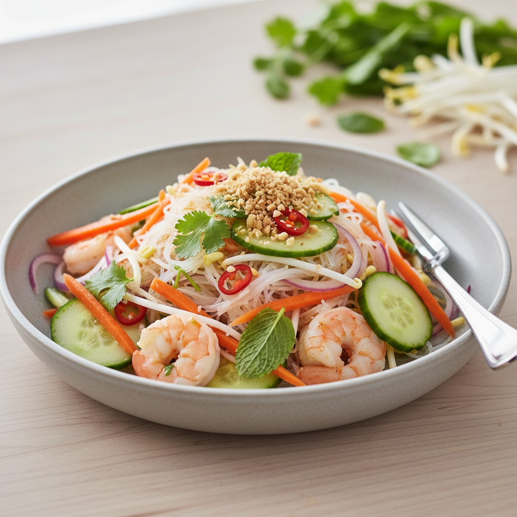 - Dans un grand saladier, mélangez délicatement les vermicelles égouttés, les légumes, les herbes, les crevettes (ou poulet/tofu). Versez la sauce et mélangez soigneusement pour bien enrober tous les ingrédients. Goûtez et rectifiez l’assaisonnement si besoin (un peu plus de citron, de nuoc-mâm ou de sucre selon l’équilibre recherché).