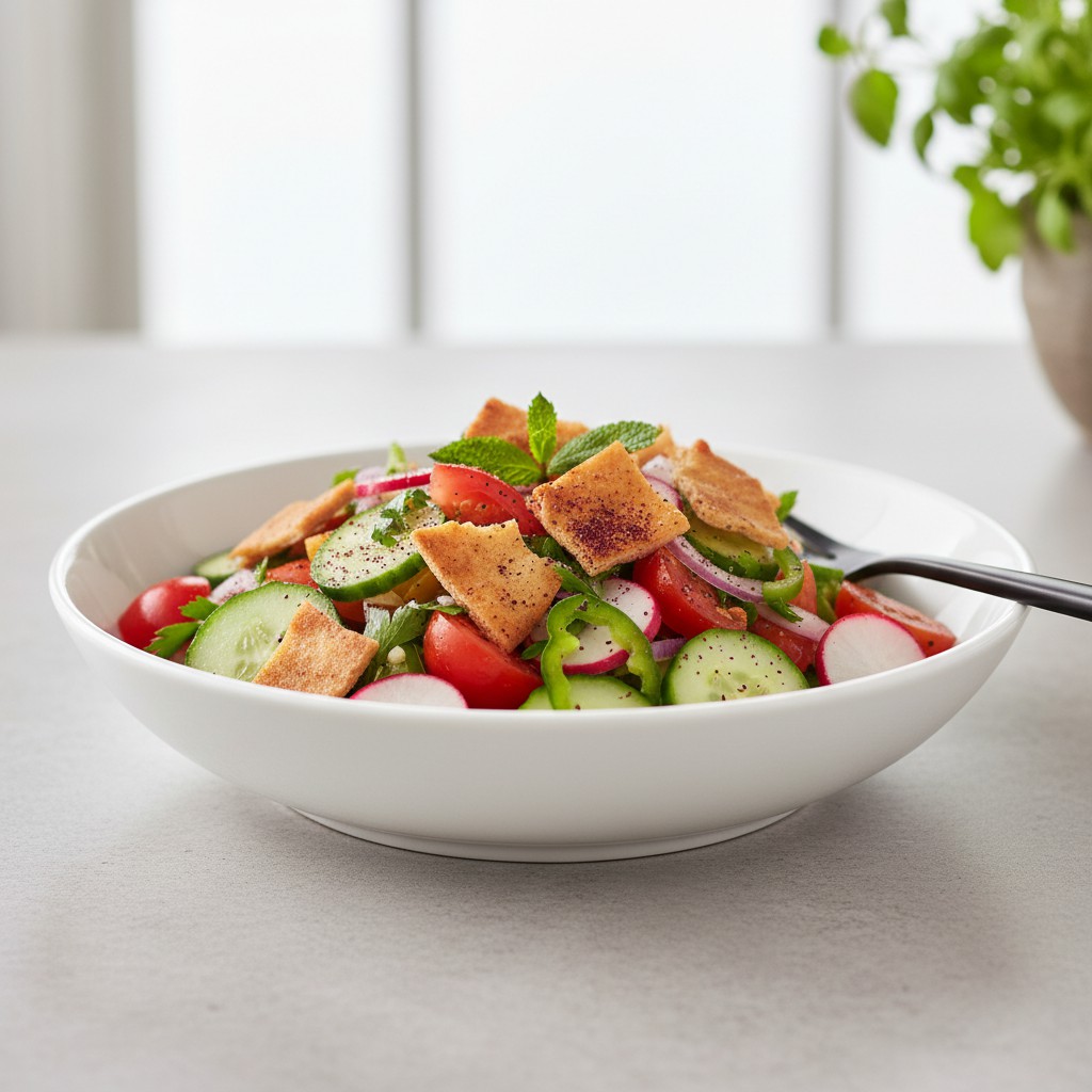 La salade fattouche est une spécialité libanaise rafraîchissante et colorée, composée de légumes croquants, d’herbes fraîches et de morceaux de pain pita grillé. Assaisonnée avec une vinaigrette au sumac, elle offre un équilibre parfait entre acidité et fraîcheur. Idéale pour accompagner des grillades ou comme plat léger.