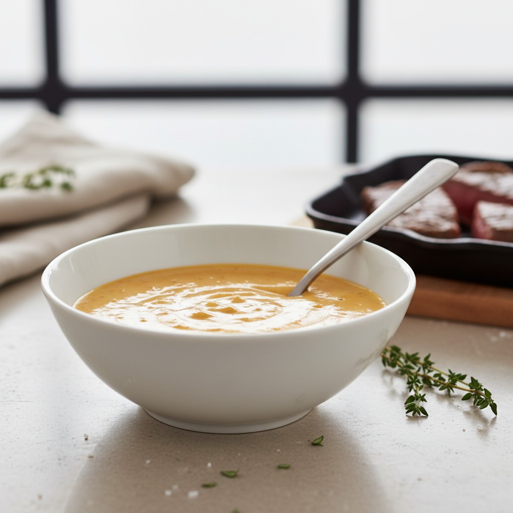 - Une fois la sauce bien lisse et onctueuse, retirez-la du feu. Servez immédiatement sur des viandes grillées, rôties ou poêlées.