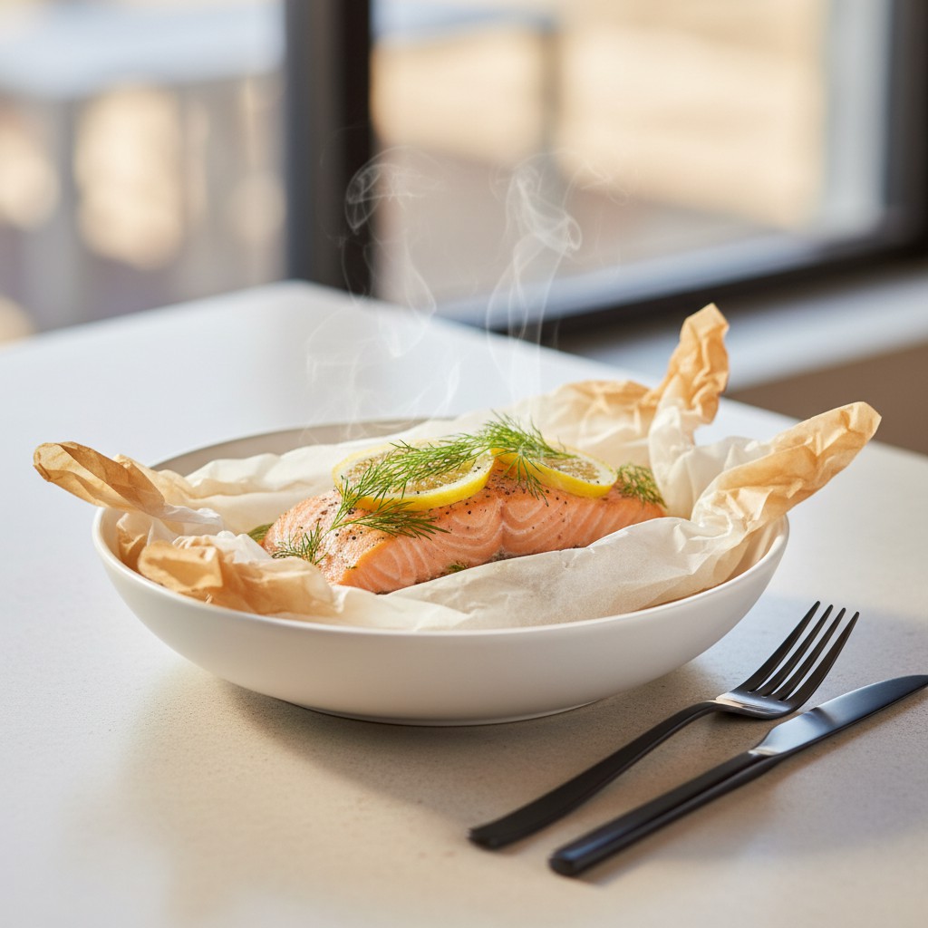 - Sortez les papillotes du four et laissez-les reposer 2 minutes avant de les ouvrir délicatement pour éviter de vous brûler avec la vapeur. Servez directement dans les papillotes pour un effet visuel agréable, accompagné de légumes vapeur ou de riz complet.