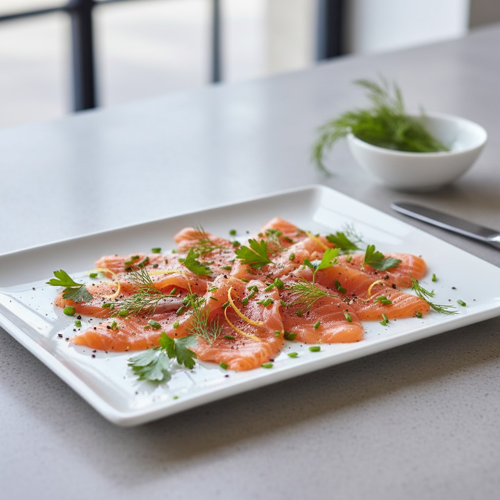 - À l’aide d’un couteau bien aiguisé, tranchez finement le saumon en biais. Disposez les tranches sur un plat de service et décorez avec les herbes fraîches réservées. Servez avec du pain de seigle, des blinis ou une salade verte.