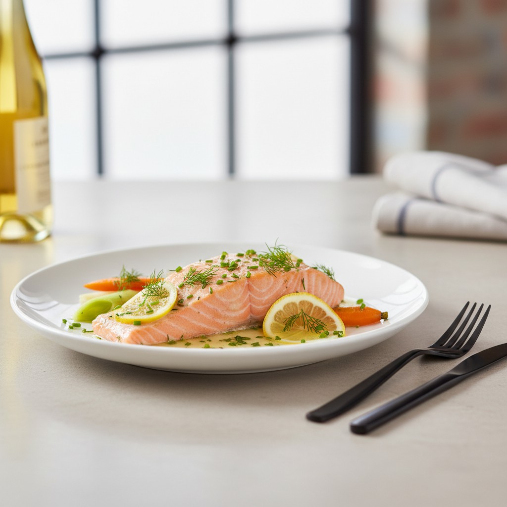 Le saumon poché au vin est un classique de la cuisine française, apprécié pour sa délicatesse et sa cuisson douce qui préserve la tendreté du poisson. Cette recette met en valeur la finesse du saumon, subtilement parfumé par un court-bouillon au vin blanc sec, aux aromates et aux légumes. Elle offre un équilibre parfait entre goût, légèreté et authenticité, tout en restant accessible à réaliser à la maison. Traditionnellement servie avec une sauce légère (type beurre blanc ou hollandaise) et des légumes vapeur, elle incarne l’élégance simple de la gastronomie bourgeoise du XIXe siècle. Idéale pour un repas raffiné sans excès de matières grasses, cette préparation permet de maîtriser la cuisson du poisson et d’en révéler toute la saveur.