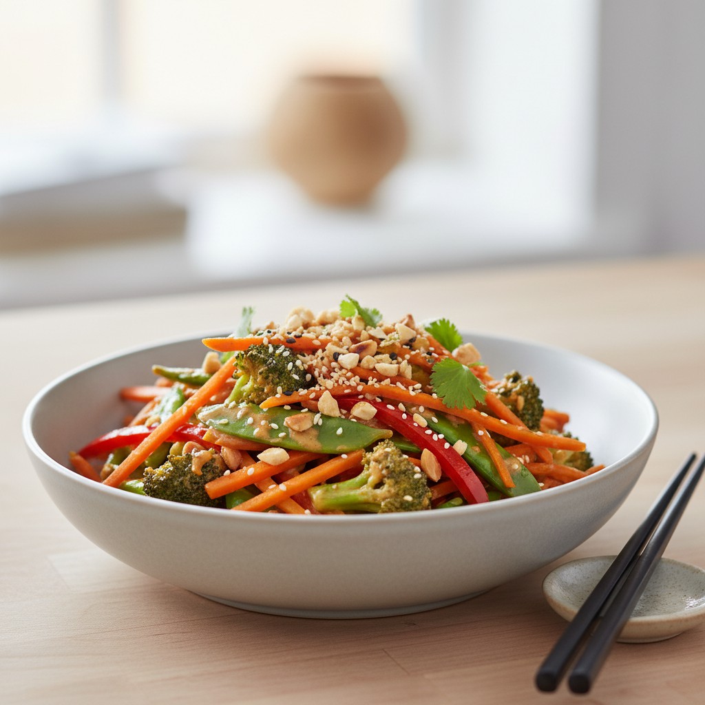 Ce sauté de légumes aux arachides est un plat d’inspiration asiatique, alliant croquant, douceur et profondeur grâce à la sauce aux cacahuètes. Riche en fibres, en protéines végétales et en bonnes graisses, il offre un équilibre nutritionnel intéressant sans sacrifier le plaisir gustatif. Ce plat, très populaire dans de nombreux pays d’Asie du Sud-Est, met en valeur la technique du sauté rapide à feu vif, qui préserve la texture et la couleur des légumes. Idéal pour un repas végétarien complet, il s’adapte facilement selon les saisons et les préférences. La sauce aux arachides, emblématique de la cuisine de rue thaïlandaise et indonésienne, apporte une touche gourmande et rassasiante.