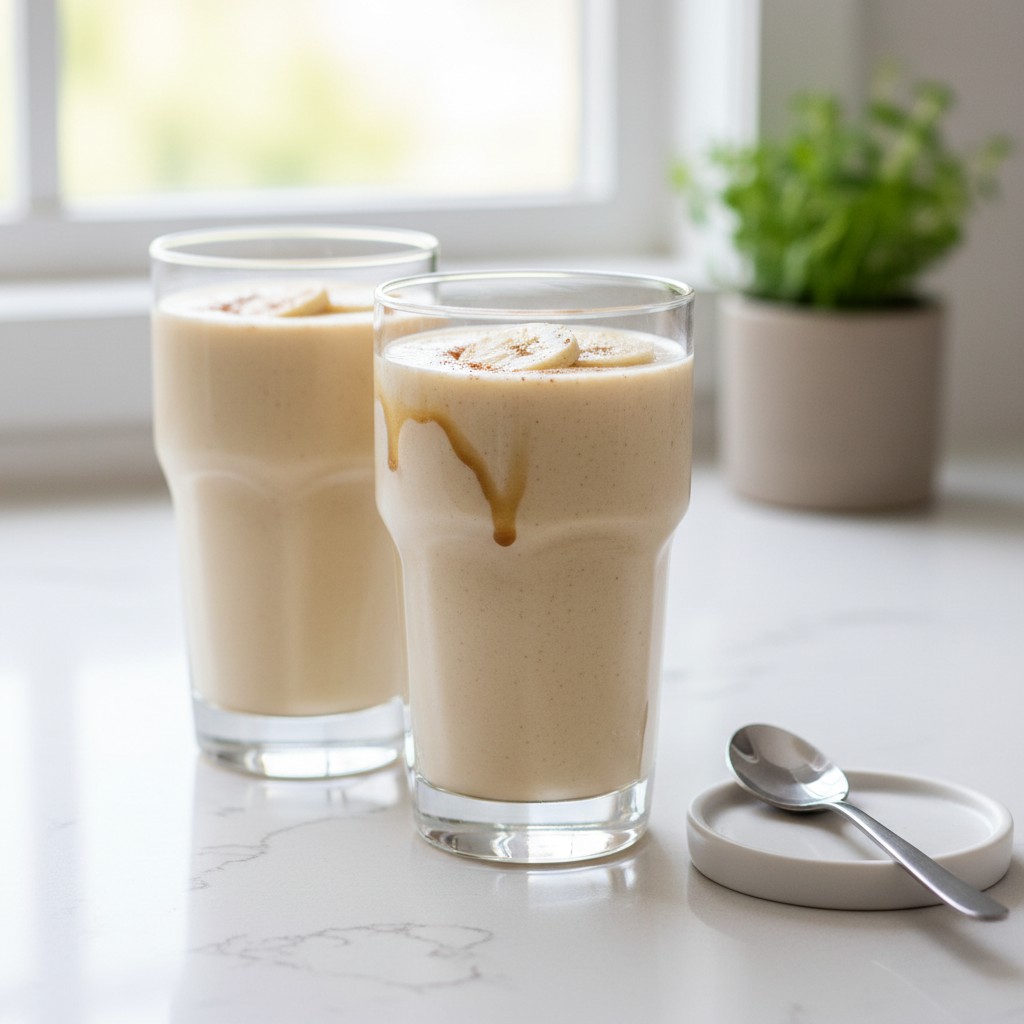 - Versez le smoothie dans des verres. Saupoudrez d’une pincée de cannelle si désiré, ou ajoutez quelques morceaux de banane ou une touche de beurre de cacahuète en décoration. Servez immédiatement.