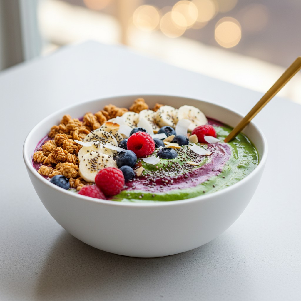 Un smoothie bowl nutritif et coloré, combinant la richesse en nutriments du chou kale avec la douceur acidulée des fruits rouges. Idéal pour un petit-déjeuner équilibré ou une collation saine, ce plat est rapide à préparer et personnalisable selon vos goûts.