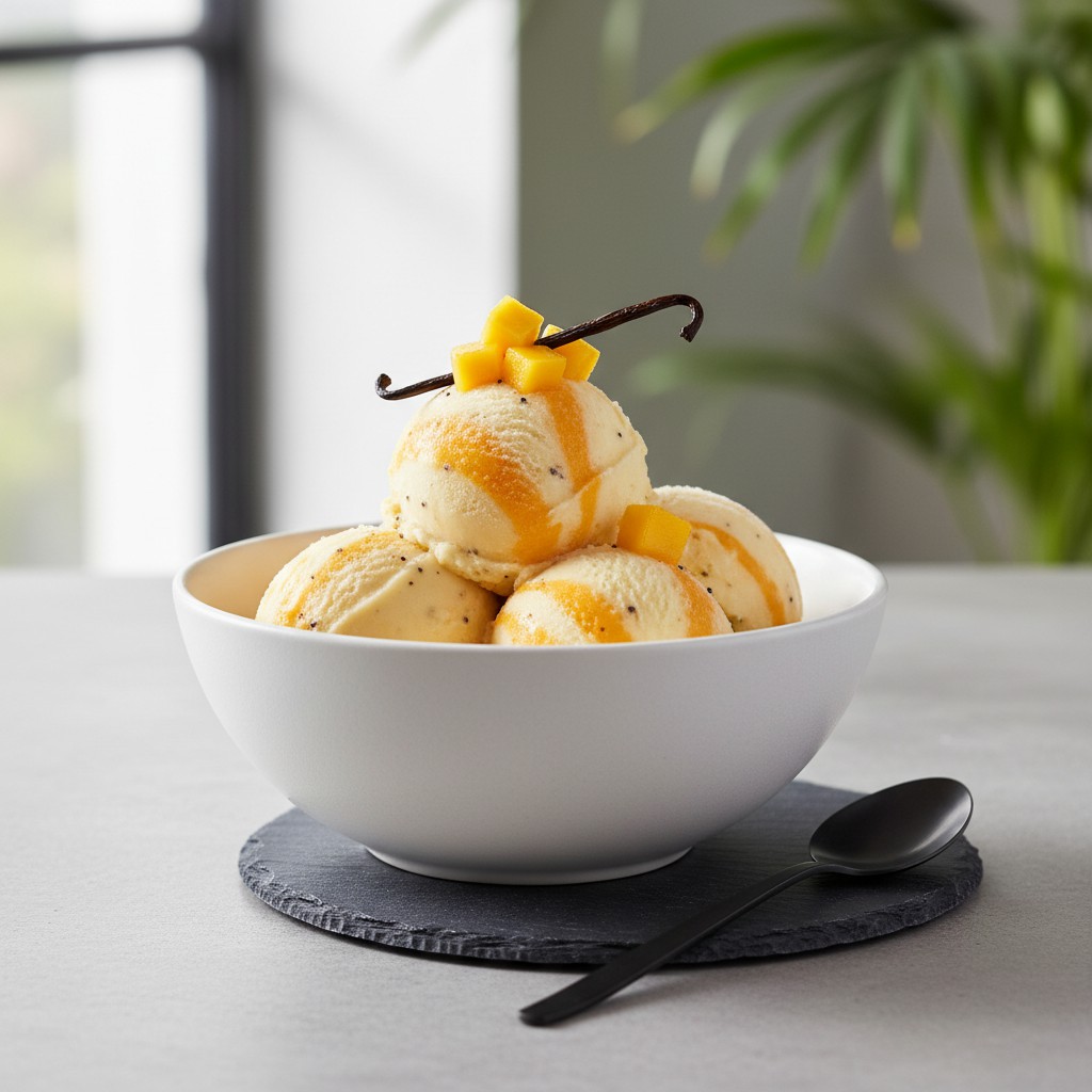 Ce sorbet à la vanille et mangue marie la douceur exotique de la mangue mûre à la rondeur parfumée de la vanille naturelle. Léger, rafraîchissant et sans matière grasse ajoutée, il offre une alternative saine aux glaces traditionnelles, tout en préservant une texture onctueuse grâce à la maîtrise du mixage et de la congélation. Originaire de la tradition des sorbets fruités, ce dessert met en valeur la simplicité des ingrédients bruts et la technique du foisonnement, héritée des glaciers italiens. Idéal pour clore un repas d’été ou pour une pause gourmande, il se distingue par son goût pur, sa couleur éclatante et sa facilité d’exécution, même sans sorbetière.