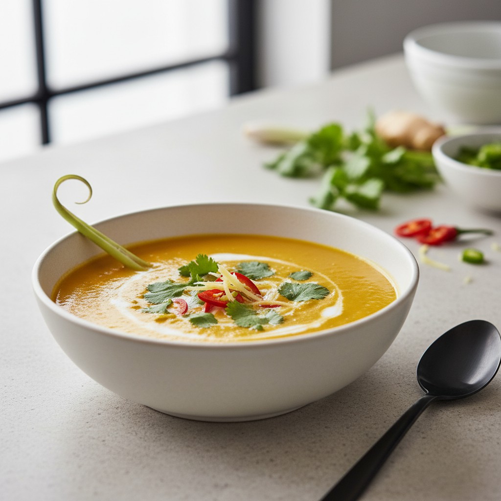La soupe de courge thaïlandaise est une alliance subtile entre la douceur de la courge et la puissance aromatique des épices et herbes typiques de la cuisine thaïe. Ce potage, inspiré des traditions du sud-est asiatique, marie lait de coco, citronnelle, gingembre et piment pour une expérience à la fois réconfortante et dépaysante. Riche en fibres, en vitamines et naturellement sans gluten, elle offre un équilibre parfait entre plaisir gustatif et bienfaits nutritionnels. Accessible à tous, cette recette permet de découvrir la cuisine thaïlandaise sans complexité technique, tout en respectant l’authenticité des saveurs.