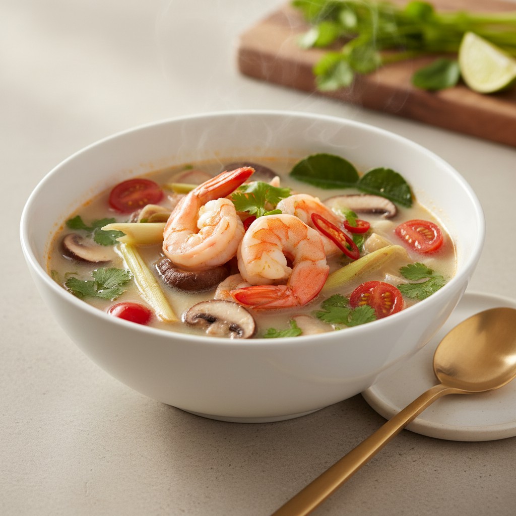 - Hors du feu, ajoutez le jus de citron vert. Goûtez et rectifiez l’assaisonnement (équilibre acidité/salé/sucre). Servez bien chaud, parsemez de coriandre fraîche ciselée. Retirez les morceaux de citronnelle, galanga et feuilles de combava avant dégustation.