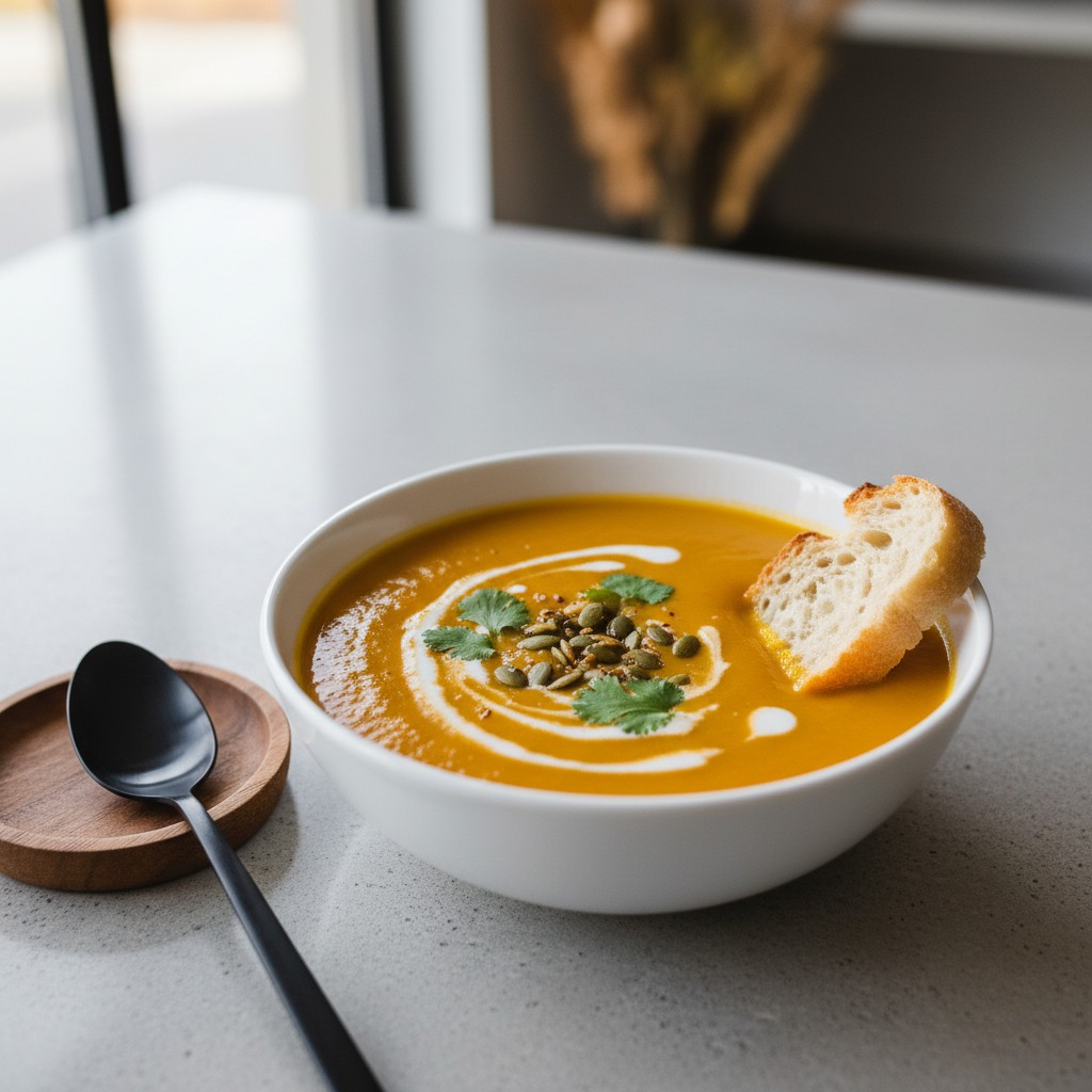 - Goûtez la soupe et ajustez l’assaisonnement avec du sel et du poivre. Servez chaud, garni de graines de courge ou d’herbes fraîches selon vos préférences.