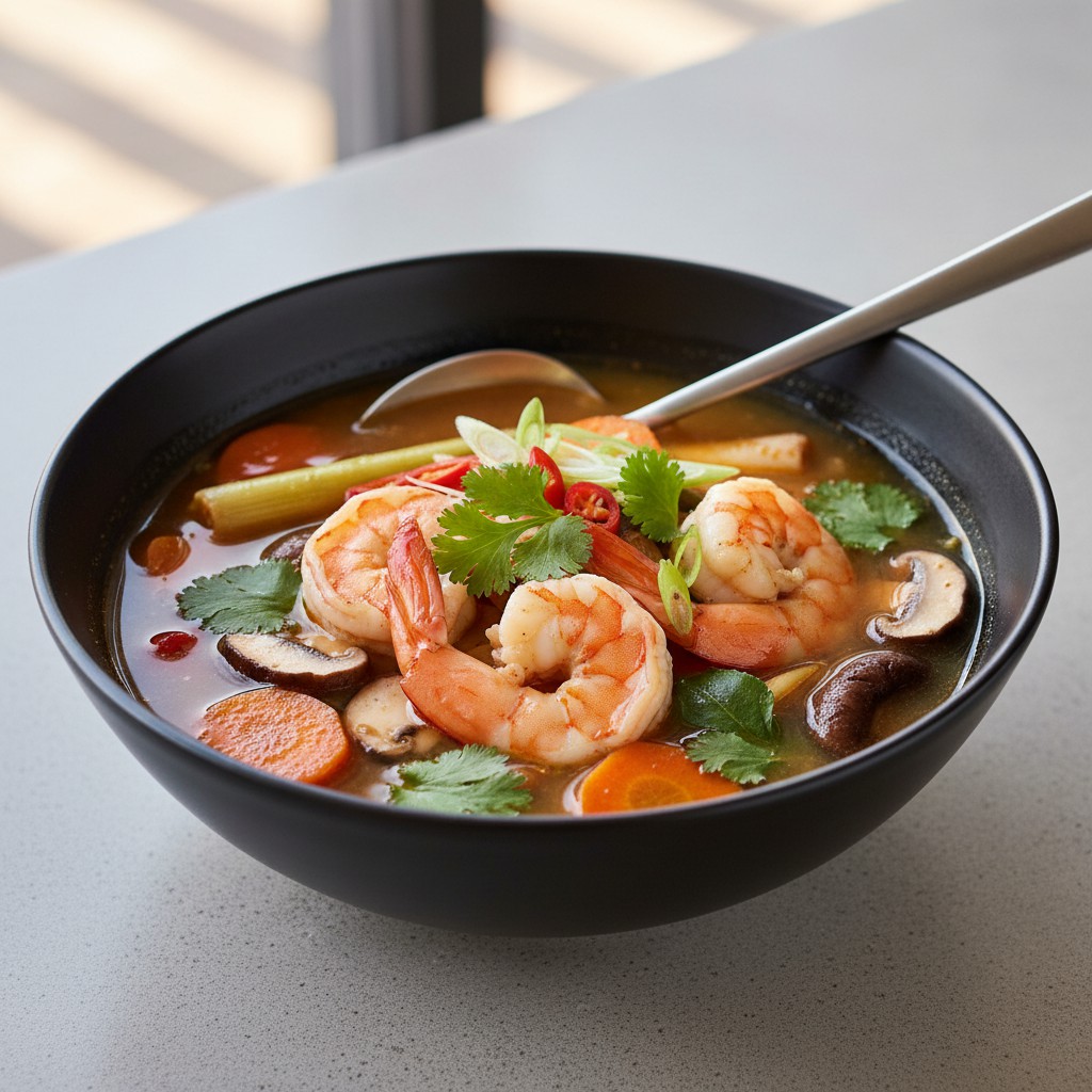 La soupe épicée de crevettes est un classique des cuisines d’Asie du Sud-Est, notamment thaïlandaise et vietnamienne. Elle séduit par son bouillon parfumé, relevé d’épices et d’herbes fraîches, qui sublime la douceur des crevettes. Cette recette allie équilibre nutritionnel (protéines maigres, légumes, peu de matières grasses) et plaisir gustatif, tout en restant accessible à la maison. Elle permet de découvrir l’art du bouillon aromatique et l’importance de la juste cuisson des crevettes pour préserver leur texture. Idéale pour un repas léger, réconfortant et dépaysant.