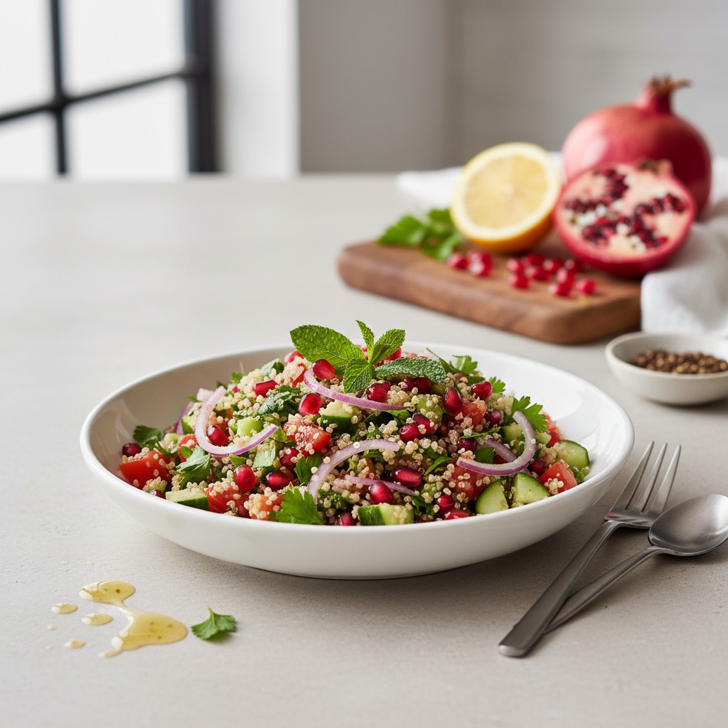 Découvrez une version moderne et équilibrée du taboulé, préparée avec du quinoa et agrémentée de graines de grenade pour une touche de fraîcheur et de croquant. Ce plat d’inspiration méditerranéenne est parfait pour un repas léger ou en accompagnement.