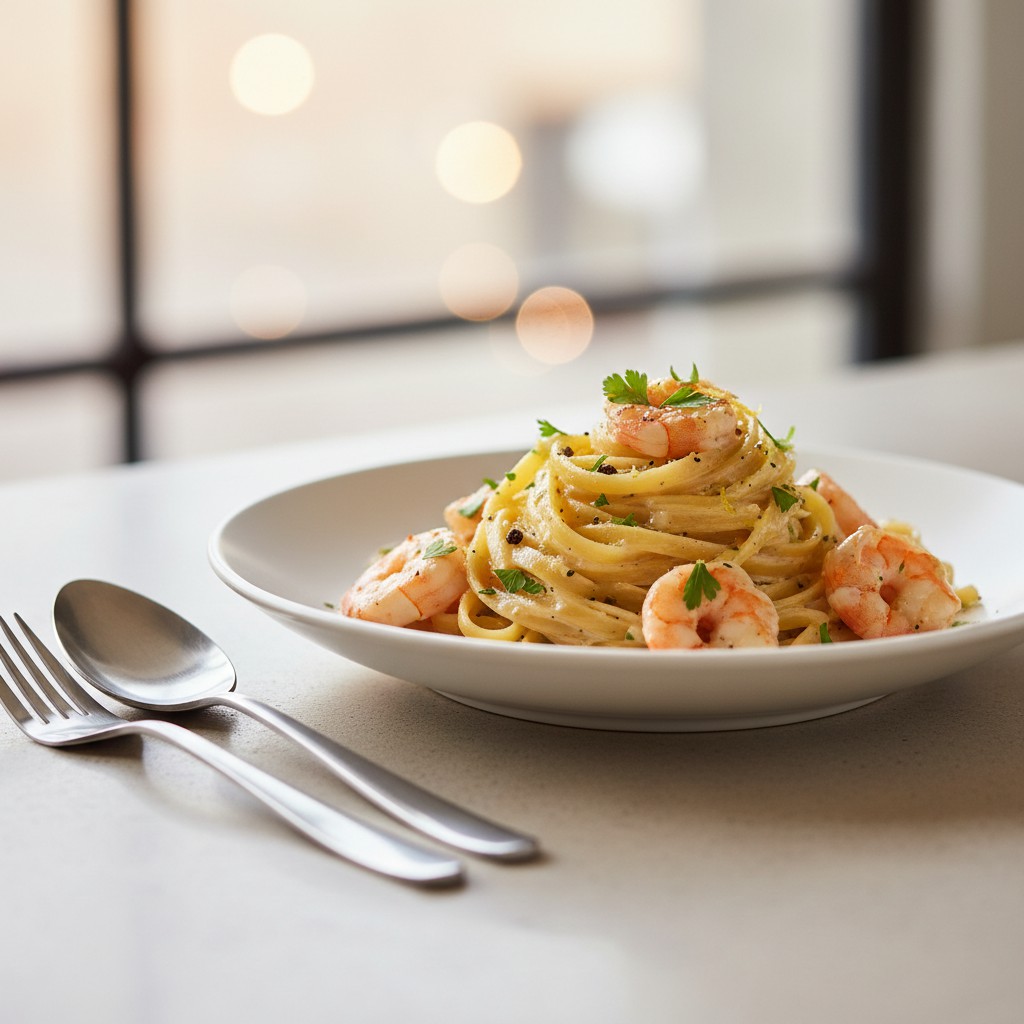Un plat de tagliatelles aux crevettes nappées d’une sauce au vin blanc, emblématique de la cuisine méditerranéenne. Cette recette marie la douceur des pâtes fraîches à la délicatesse des crevettes, relevées par une sauce onctueuse et parfumée. L’équilibre entre les protéines maigres, les glucides complexes et la sauce légère en fait un plat convivial, raffiné mais accessible. Traditionnellement, ce type de recette s’inspire des tables italiennes et françaises du littoral, où la fraîcheur des produits de la mer est sublimée par des sauces simples et justes.