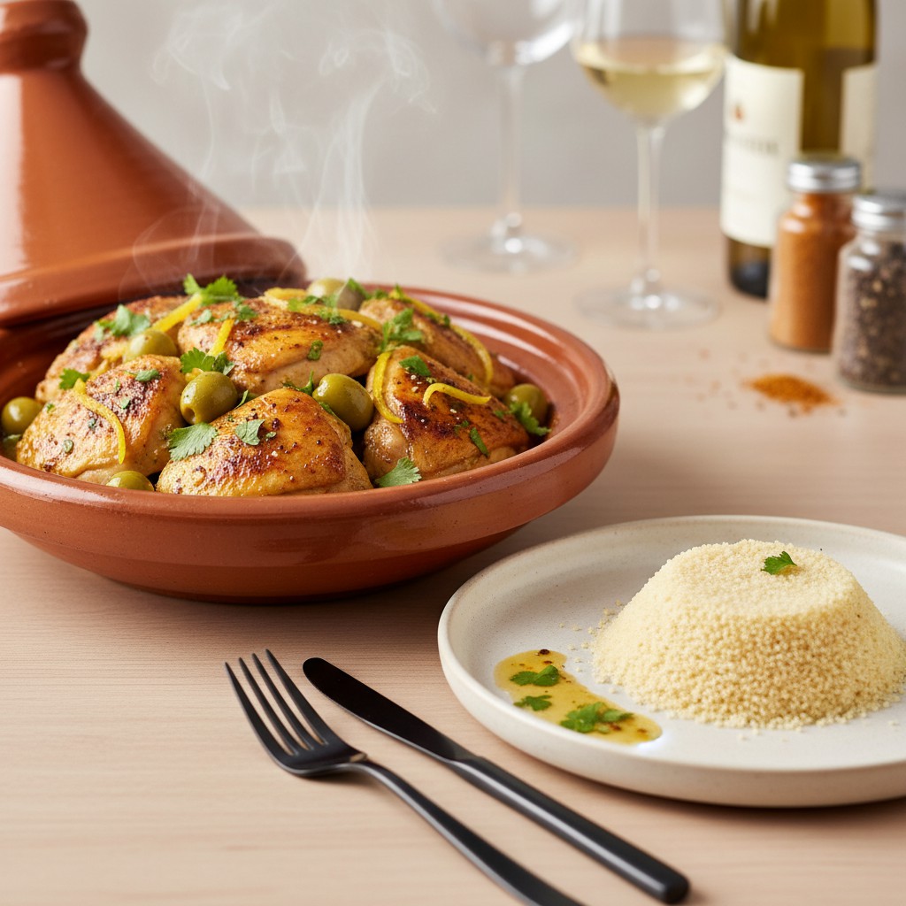 Le tajine de poulet aux olives et vin est un plat emblématique de la cuisine maghrébine, revisité ici avec une touche méditerranéenne grâce à l’ajout de vin blanc sec. Ce plat mijoté associe la tendreté du poulet, la saveur acidulée des olives et la complexité aromatique des épices. Il est apprécié pour son équilibre entre gourmandise, authenticité et convivialité. Traditionnellement préparé dans un plat en terre cuite, le tajine favorise une cuisson douce qui concentre les saveurs. Cette version, accessible à tous, met l’accent sur la justesse des cuissons, l’harmonie des épices et la maîtrise de la sauce, pour un résultat savoureux et sain, sans excès de matières grasses.
