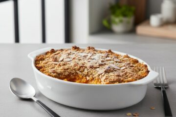 - Enfournez la tarte pendant 35 minutes, ou jusqu’à ce que le dessus soit doré et que la garniture soit bien prise. Laissez tiédir avant de servir.
