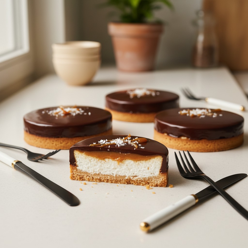 Ces tartes individuelles s’inspirent du célèbre chocolat Bounty, associant une base croustillante, une garniture coco fondante et un caramel onctueux, le tout recouvert d’un glaçage chocolat noir. Cette recette marie gourmandise et équilibre, en jouant sur les textures et la juste dose de sucre. Elle revisite un classique de la confiserie dans une version pâtissière, accessible à la maison, tout en respectant l’esprit originel : la générosité de la noix de coco et la puissance du chocolat. Idéale pour les amateurs de desserts exotiques et régressifs, cette tarte met en avant la maîtrise des cuissons et l’assemblage précis pour un résultat digne d’une pâtisserie.