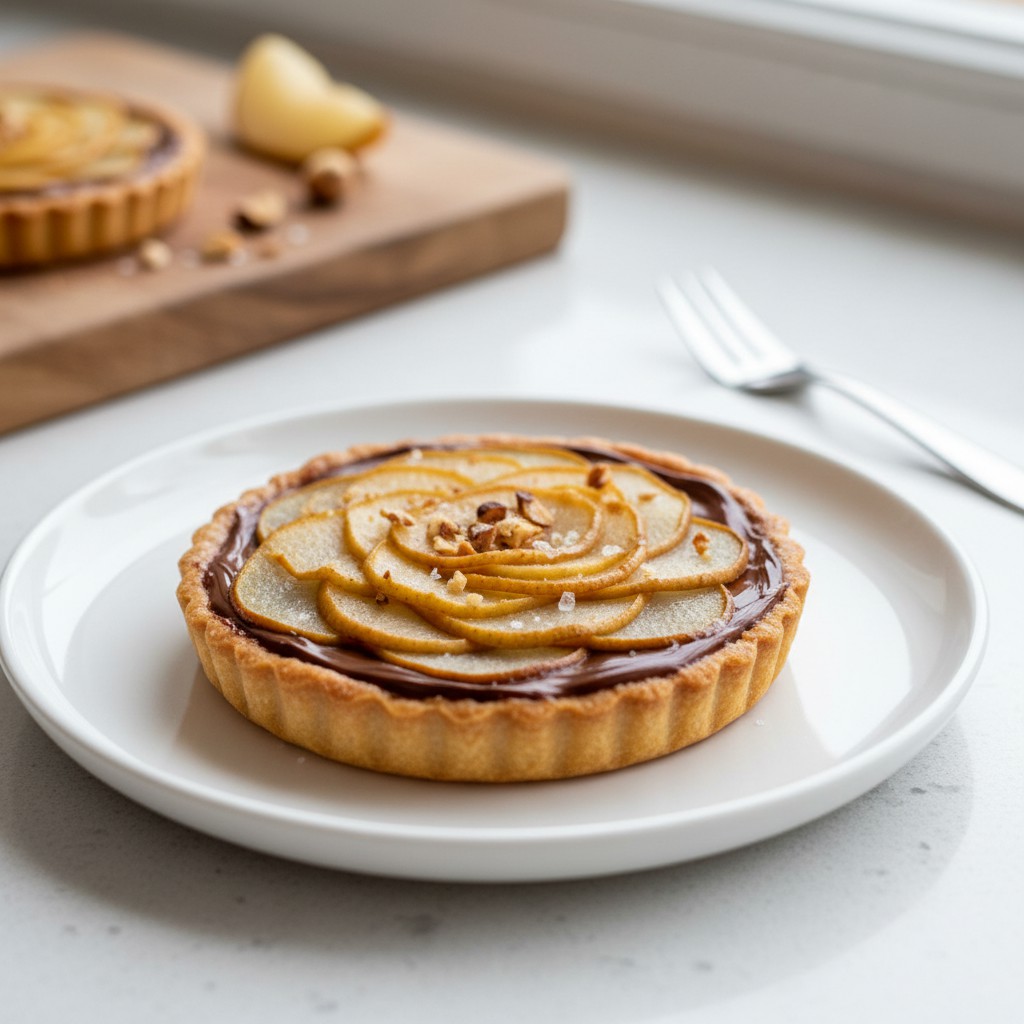 - Étalez une fine couche de Nutella (environ 15 g) sur chaque fond de tartelette refroidi. Disposez harmonieusement les lamelles de poire en rosace ou en éventail. Pour plus de gourmandise, ajoutez quelques noisettes concassées sur le dessus.