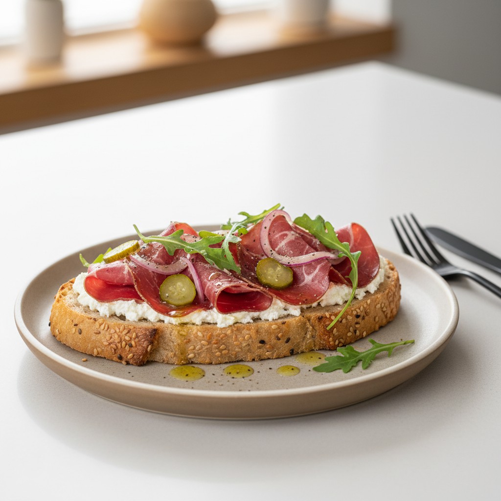 Une tartine gourmande et équilibrée, combinant le croquant du pain au sésame, la saveur intense de la viande séchée et l’acidité des pickles maison. Idéale pour un déjeuner rapide ou une entrée originale, cette recette met en avant des saveurs contrastées et des textures variées.