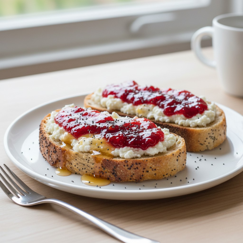 Une tartine gourmande et équilibrée, combinant le croquant du pain aux graines de pavot, la douceur crémeuse de la ricotta et la saveur sucrée-acidulée d’une confiture de fruits maison. Parfaite pour un petit-déjeuner ou un brunch rapide et nutritif.