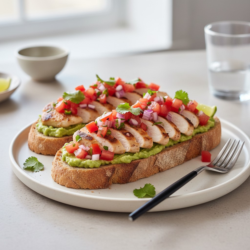 - Étalez une fine couche d’avocat écrasé sur les tranches de pain grillé (optionnel). Disposez les tranches de poulet grillé sur le dessus, puis ajoutez généreusement la salsa maison. Servez immédiatement.