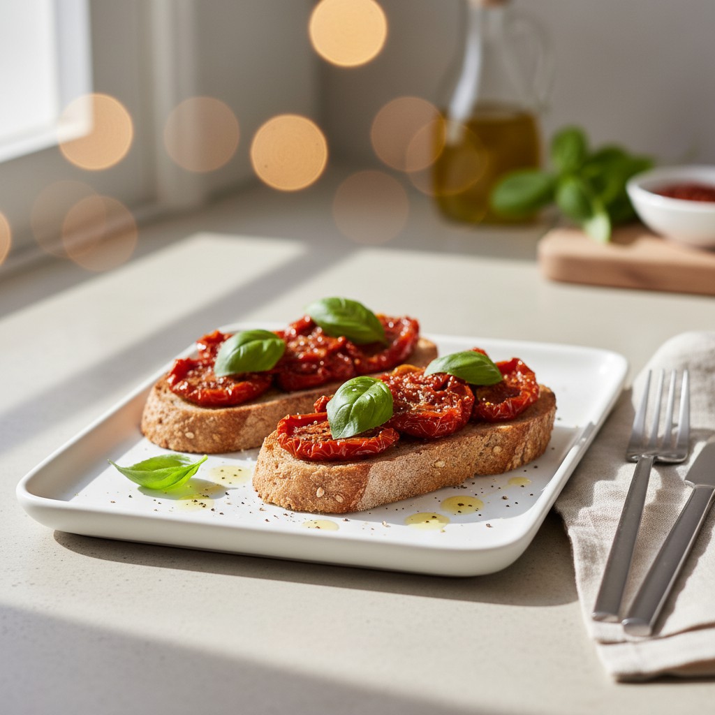Une recette simple et rapide pour préparer des tartines de pain grillé garnies de tomates séchées, de basilic frais et d’une touche d’huile d’olive. Idéale pour un apéritif, un brunch ou une entrée légère, cette recette met en valeur des saveurs méditerranéennes authentiques.