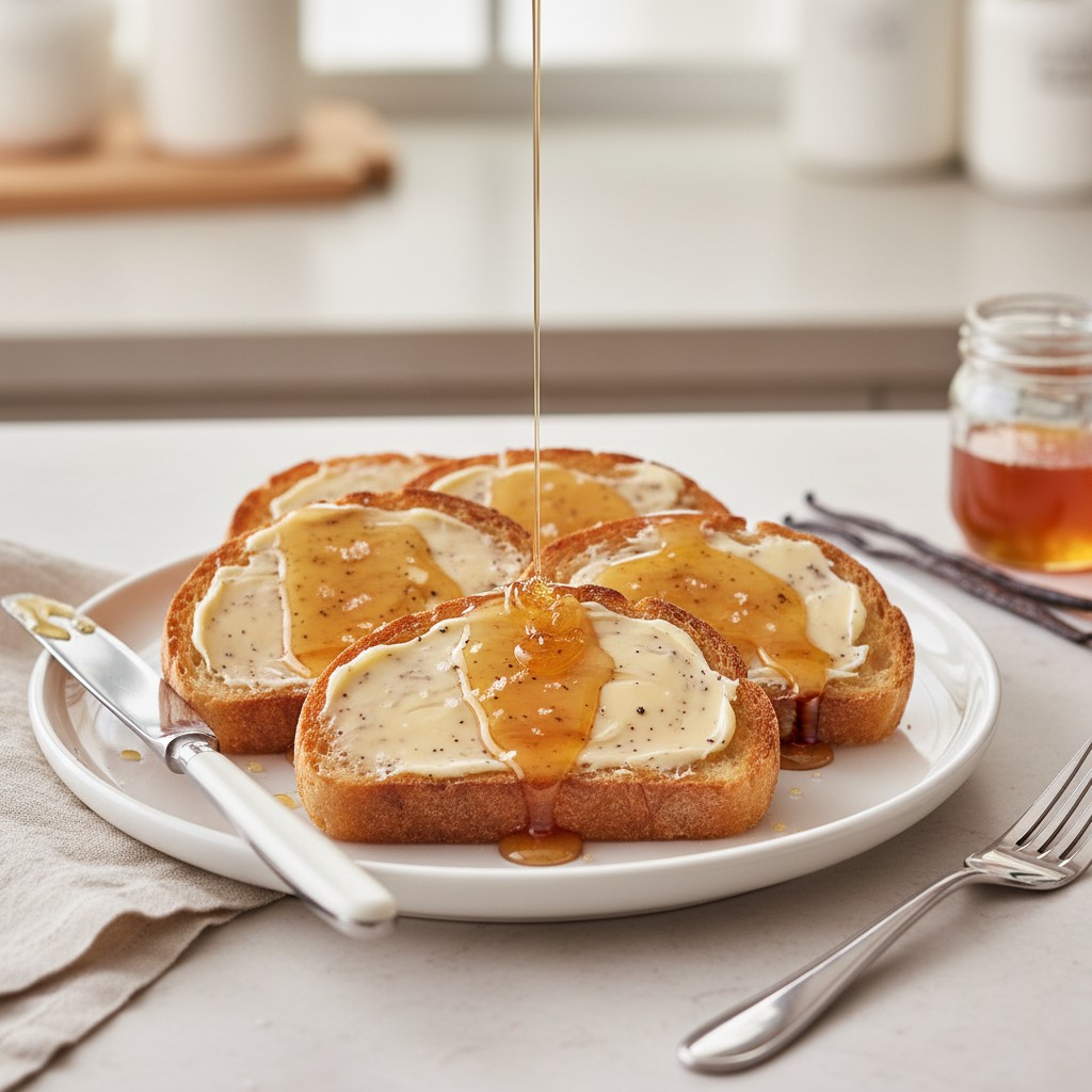 Ces tartines de pain grillé à la vanille et miel offrent une alliance subtile entre la douceur du miel, la chaleur aromatique de la vanille et le croustillant du pain. Idéales pour un petit-déjeuner gourmand ou un goûter réconfortant, elles illustrent la simplicité raffinée de la cuisine maison. Cette recette s’inspire des traditions européennes où le pain grillé, souvent agrémenté de beurre et de miel, est un classique. L’ajout de vanille apporte une touche d’originalité et d’élégance, tout en restant accessible. L’équilibre nutritionnel est respecté : glucides complexes du pain, sucres naturels du miel, et possibilité d’ajuster la matière grasse selon vos besoins.