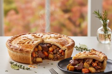 - Badigeonnez le dessus de la tourte avec le jaune d’œuf pour une belle dorure. Enfournez pendant 40 minutes, ou jusqu’à ce que la pâte soit bien dorée et croustillante.