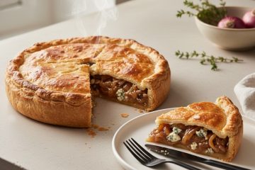 - Enfournez la tourte pendant 35 à 40 minutes, ou jusqu’à ce qu’elle soit bien dorée et croustillante. Laissez reposer 5 minutes avant de servir pour faciliter la découpe.
