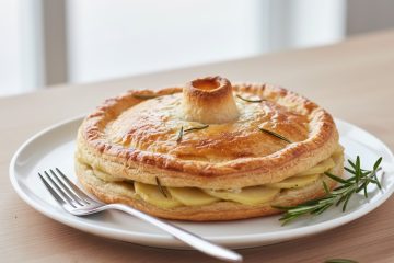 - Badigeonnez la surface de la tourte avec le jaune d’œuf pour une belle dorure. Enfournez pendant 35 à 40 minutes, ou jusqu’à ce que la pâte soit bien dorée et croustillante. Laissez reposer 5 minutes avant de servir.