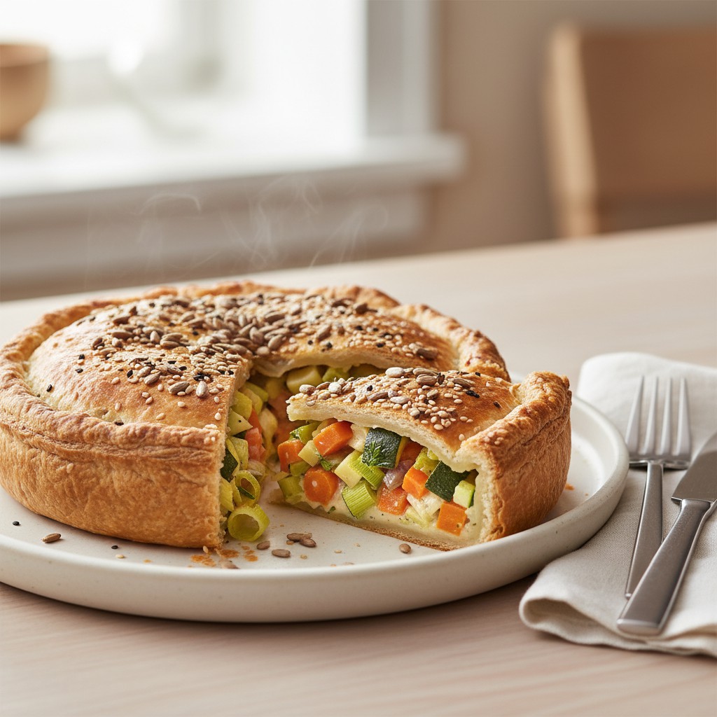 - Préchauffez le four à 200°C (chaleur tournante). Étalez une pâte feuilletée dans un moule à tarte ou à tourte. Piquez le fond avec une fourchette. Versez la garniture de légumes sur la pâte, en l’étalant uniformément. Recouvrez avec la deuxième pâte feuilletée. Scellez les bords en les pinçant et faites une petite cheminée au centre pour laisser la vapeur s’échapper.