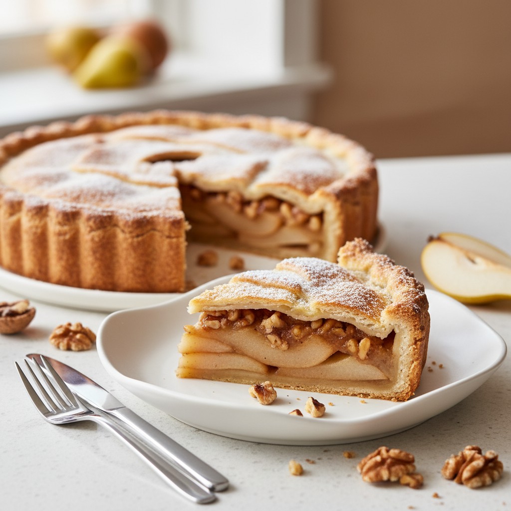 Cette tourte aux poires et noix est un dessert rustique et gourmand, parfait pour les amateurs de saveurs automnales. L’association des poires juteuses et des noix croquantes, enveloppées dans une pâte dorée, offre un équilibre parfait entre douceur et texture. Originaire des régions où les fruits à coque et les poires sont abondants, cette recette est simple à réaliser et idéale pour un dessert ou un goûter convivial.