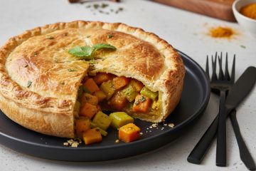 - Recouvrez avec la deuxième pâte brisée. Scellez les bords en les pinçant avec vos doigts ou une fourchette. Faites une petite incision au centre pour permettre à la vapeur de s’échapper pendant la cuisson.