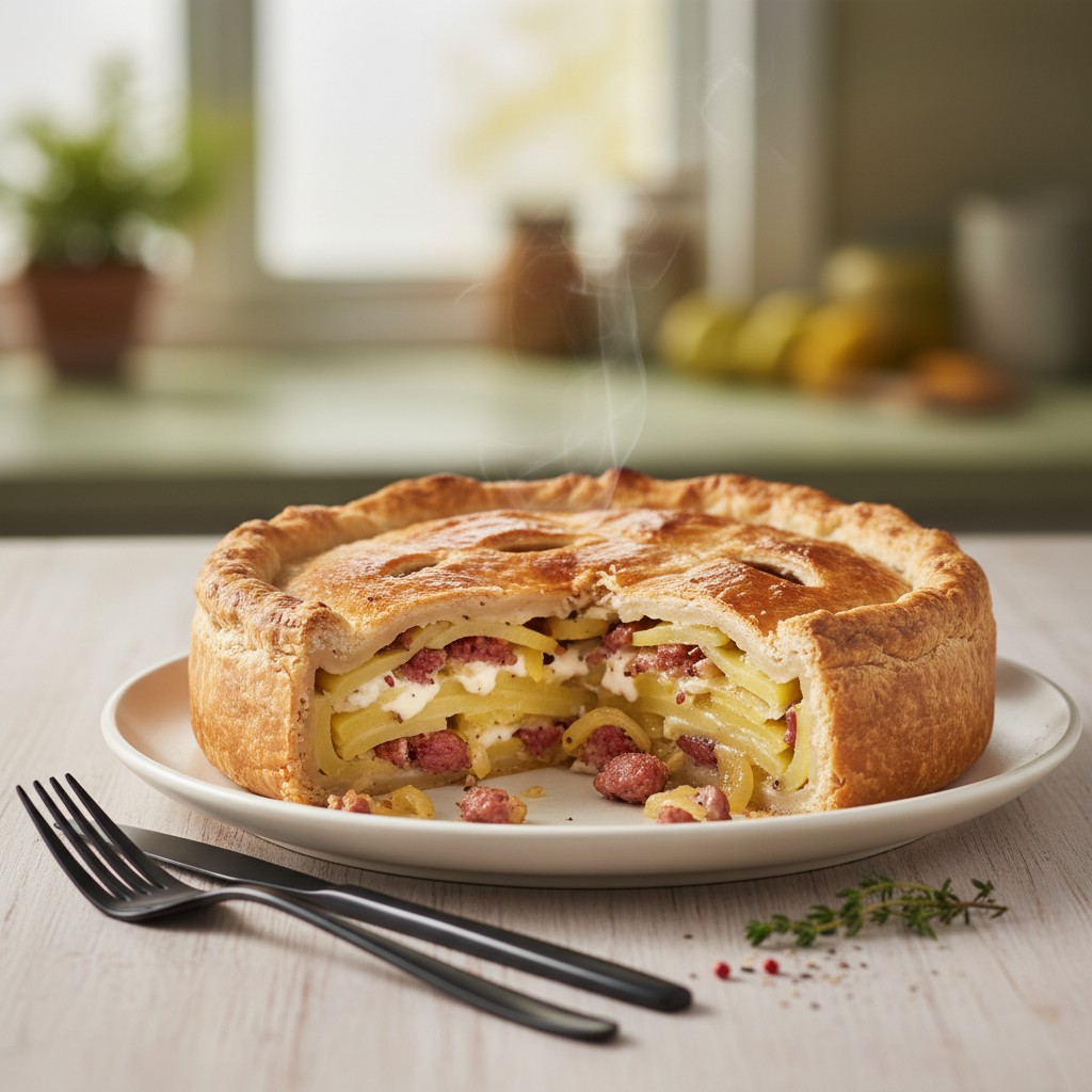 Cette tourte aux pommes de terre et saucisse est un plat réconfortant et généreux, parfait pour les repas en famille ou entre amis. Inspirée des traditions culinaires françaises, elle combine la douceur des pommes de terre fondantes et le goût savoureux des saucisses, le tout enveloppé dans une pâte dorée et croustillante. Facile à préparer, elle peut être adaptée avec des ingrédients de saison ou des alternatives plus légères.
