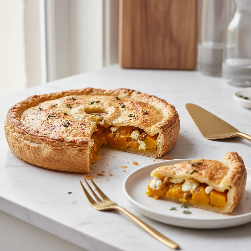 Cette tourte salée associe la douceur du butternut à un mélange d’épices réconfortantes, le tout enveloppé dans une pâte dorée et croustillante. Inspirée des saveurs automnales, elle est idéale pour un repas convivial ou un dîner végétarien équilibré.