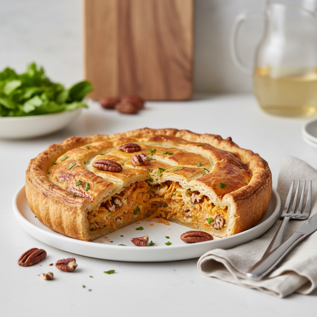 Cette tourte salée associe la douceur des carottes à la texture croquante des noix de pécan, le tout enveloppé dans une pâte dorée et croustillante. Inspirée des saveurs automnales, elle est idéale pour un repas végétarien équilibré et réconfortant.