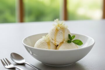 - Incorporez la crème fraîche et le sirop de fleurs de sureau. Mélangez bien, puis ajustez l’assaisonnement avec du sel et du poivre selon votre goût.