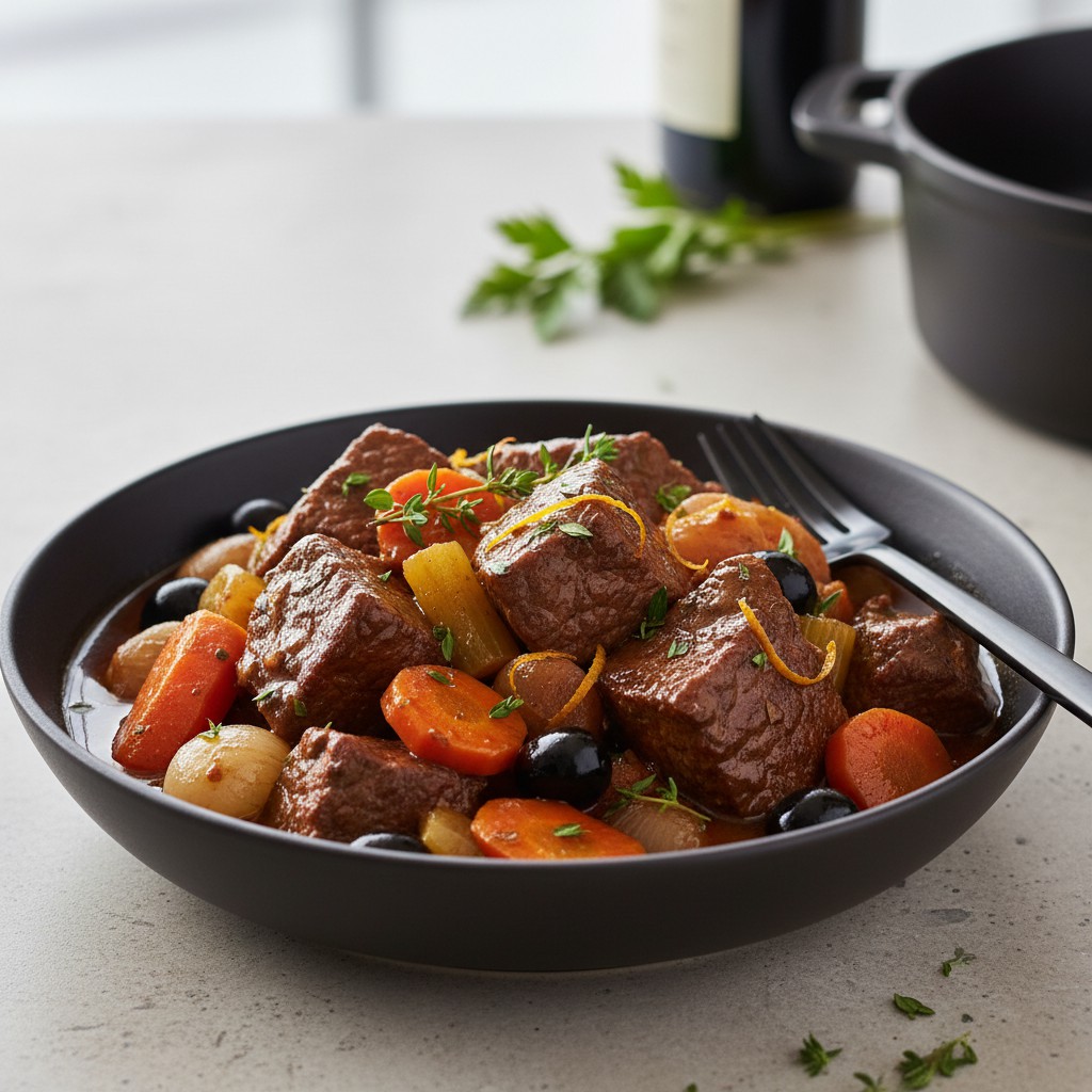 - En fin de cuisson, rectifiez l’assaisonnement. Ajoutez les olives noires et laissez infuser 10 minutes. Retirez le bouquet garni et le zeste d’orange. Servez bien chaud, accompagné de pâtes fraîches, pommes de terre vapeur ou polenta. La daube est encore meilleure réchauffée le lendemain.