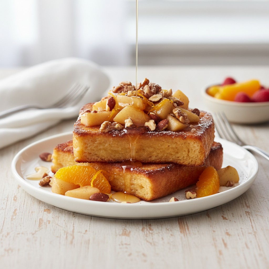 - Disposez une tranche de brioche perdue dans chaque assiette. Répartissez les fruits poêlés dessus, ajoutez un filet de miel ou de sirop d’érable si désiré. Parsemez éventuellement de fruits secs concassés pour le croquant. Servez immédiatement.