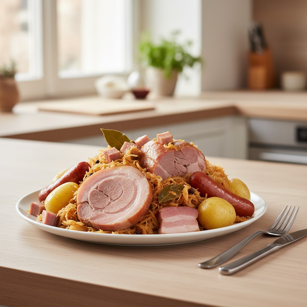 - Retirez délicatement les viandes et les saucisses. Dressez la choucroute au centre d’un grand plat chaud, disposez les viandes tranchées et les pommes de terre autour. Servez bien chaud, accompagné de moutarde forte et, idéalement, d’un vin blanc d’Alsace.