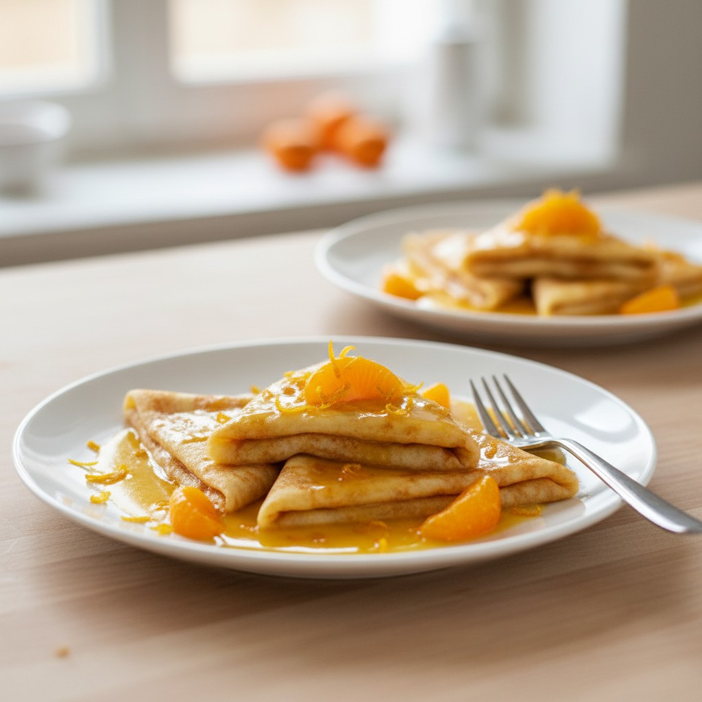 - Disposez les crêpes nappées de sauce sur des assiettes chaudes. Décorez de quartiers de clémentine frais et, si désiré, d’un peu de zeste râpé. Servez immédiatement pour profiter de la texture moelleuse et du parfum intense.