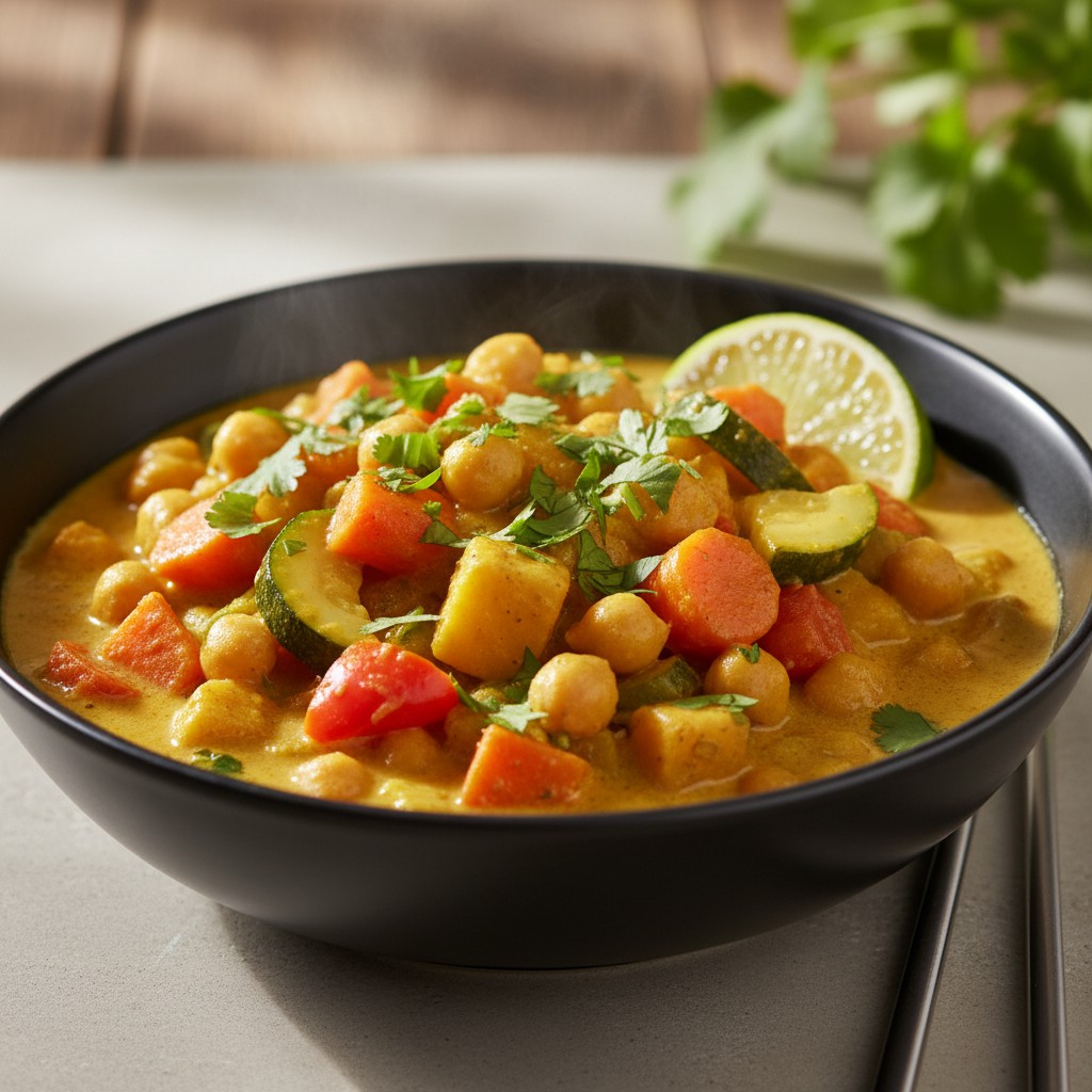 Ce curry de légumes et lait de coco est un plat végétarien emblématique d’Asie du Sud-Est, particulièrement apprécié pour sa richesse aromatique, sa douceur et sa polyvalence. Il marie la rondeur du lait de coco à la fraîcheur des légumes de saison, relevés par un mélange d’épices équilibré. Ce plat, traditionnellement partagé en famille, est à la fois nourrissant, digeste et accessible, même pour les cuisiniers débutants. Il met en avant la simplicité du fait-maison sans sacrifier la profondeur des saveurs, tout en offrant une belle alternative végétale, rassasiante et colorée.