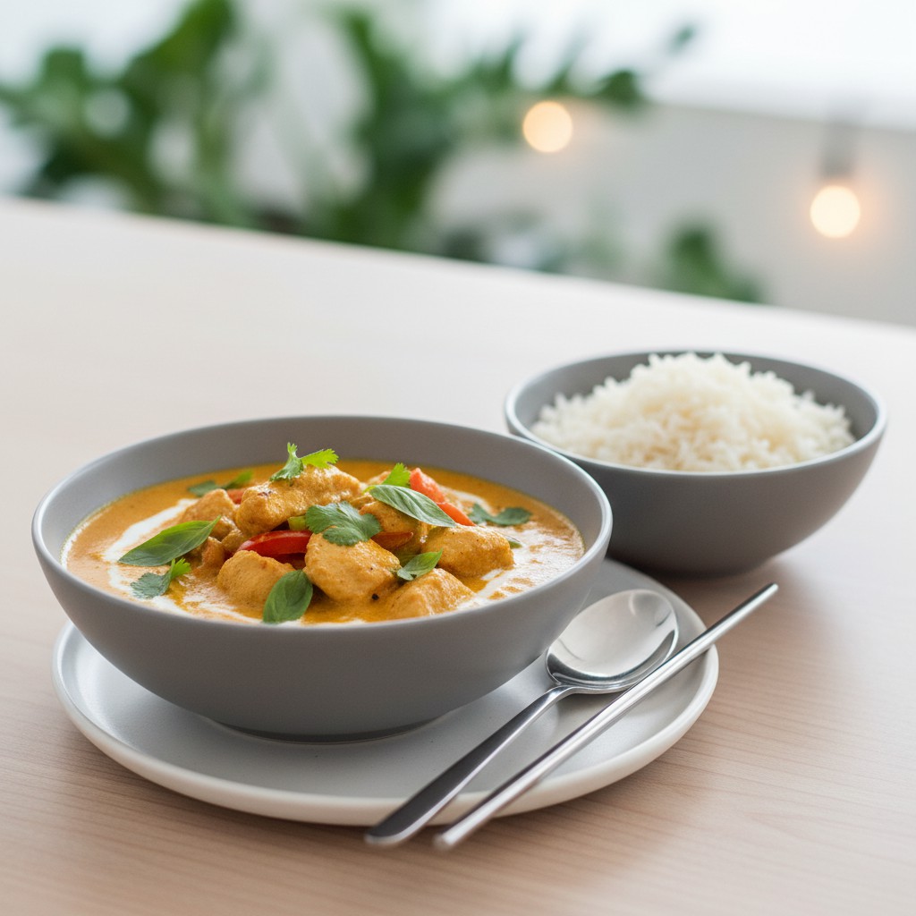 - Goûtez et ajustez l’assaisonnement : sel, poivre, un trait de jus de citron vert pour la fraîcheur. Si la sauce est trop épaisse, ajoutez un peu d’eau ou de lait de coco. Servez bien chaud, parsemé de coriandre fraîche ou de basilic thaï, accompagné de riz basmati ou thaï.